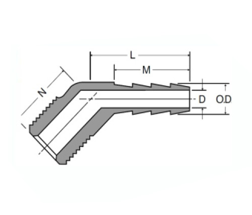45-graders armbåge för att ansluta slang till gängat rör i en vinkelbeslag ansluter till slang i ena änden och har en NPT-manlig kontakt på.