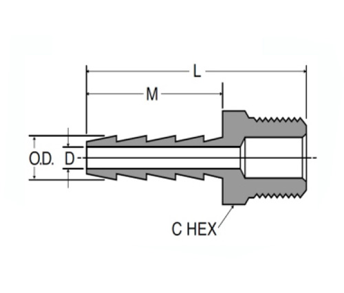 Den 125 slangstången till hanröret har en mässingskropp och fluorkol-O-ringar. Den har en manlig röränd, NPT raka trådar och en metrisk trådsort. Denna produkt är kompatibel med gummislang och GPH -slang.